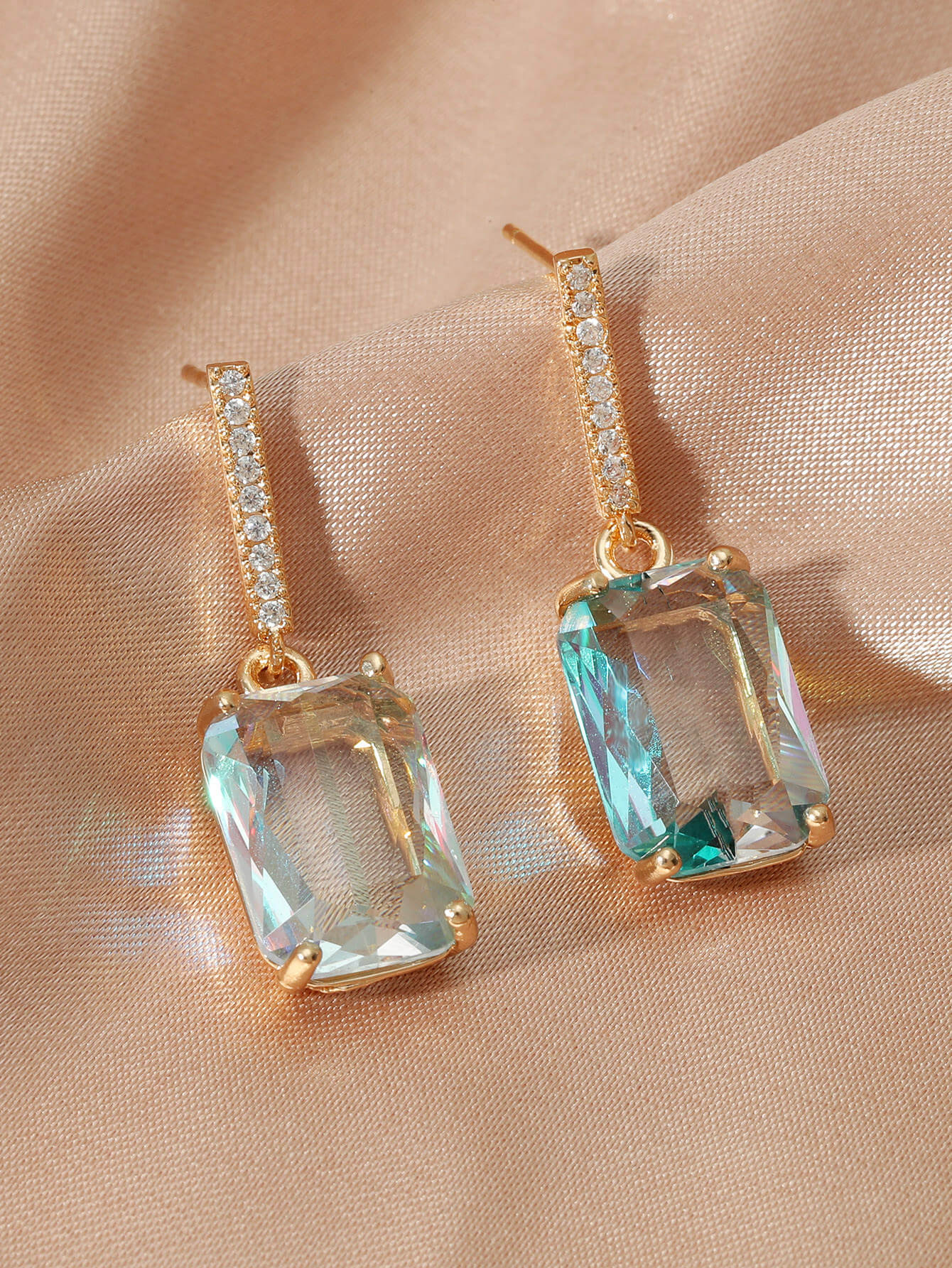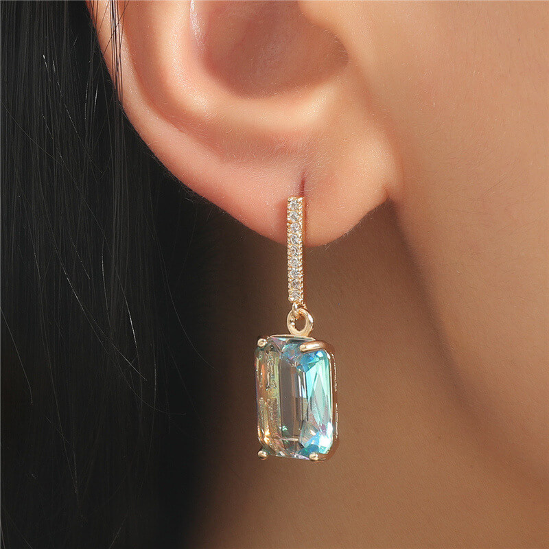 These elegant stud earrings feature radiant Aqua Aura crystals, cut in a refined rectangular shape and securely set in polished gold prongs. The vibrant blue tones of the crystal shimmer with an iridescent glow, creating a luminous contrast against the warm golden setting. Lightweight and timeless, they are perfect for everyday elegance or to add a sophisticated touch to evening wear.
