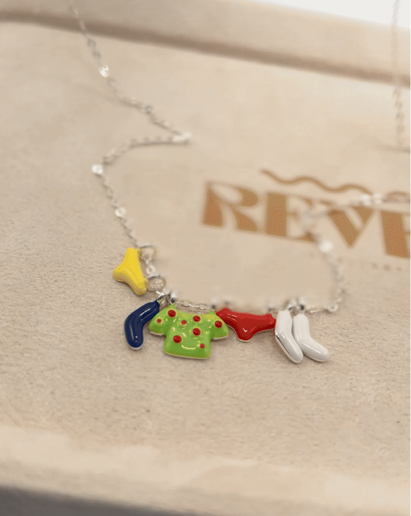 Crafted in 925 sterling silver, this unique necklace features hand-painted enamel charms shaped like tiny clothes hanging on a line, a delightful design that captures the spirit of carefree days.